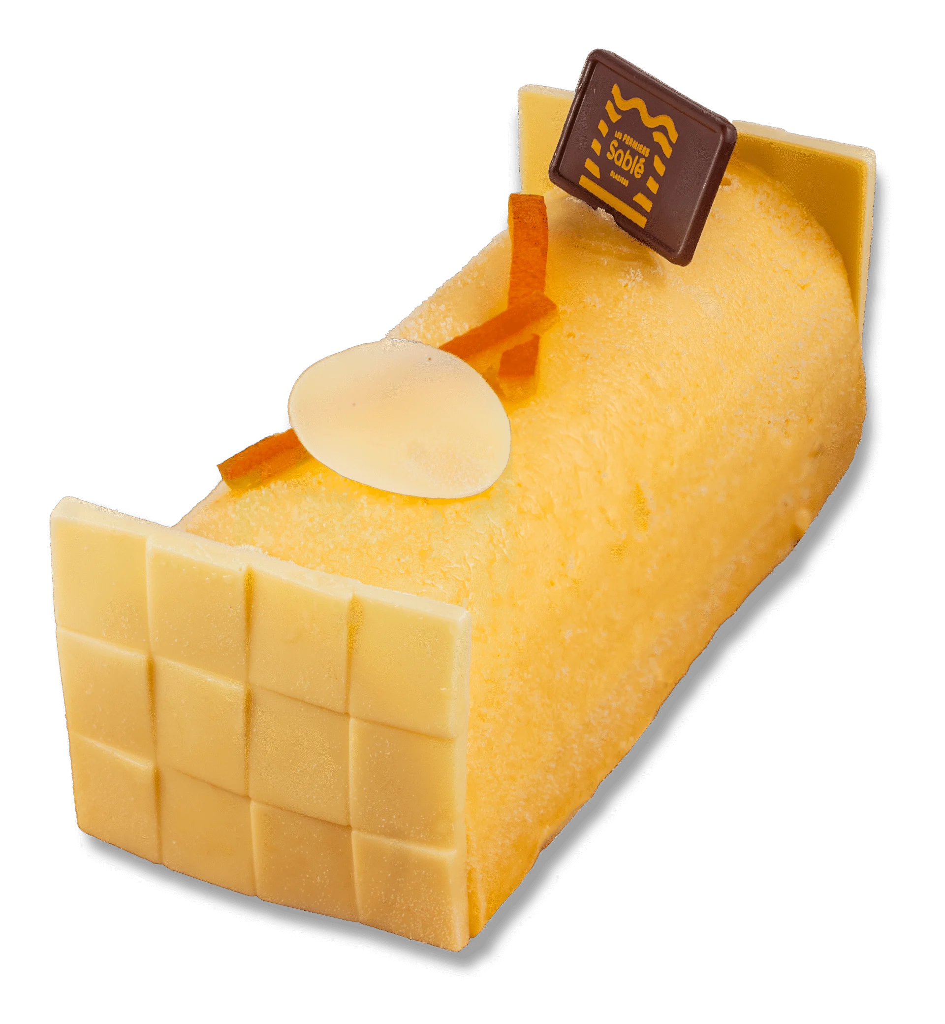 Sorbet mandarine et un insert Duo de sorbet citron sur un financier croustillant